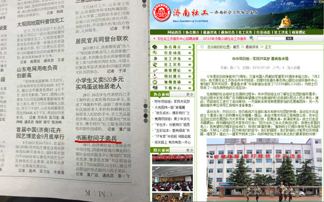 紀(jì)念抗日戰(zhàn)爭(zhēng)勝利70周年暨中國(guó)人民解放軍建軍88周年來臨之際,濟(jì)南市市政工程有限公司團(tuán)委的青年志愿者們與市中區(qū)社工組織一起來到軍區(qū)某部隊(duì)開展了一次“擁軍慶祝進(jìn)軍營(yíng)揮毫潑墨獻(xiàn)深情”的曲藝、書法交流慰問活動(dòng)。
