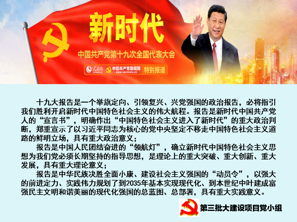 市政集團副經(jīng)理、黨小組長帶領(lǐng)黨員同志們學習。他要求項目黨員同志們:一定要全面、深入領(lǐng)會黨的十九大報告精神實質(zhì)。不忘初心,牢記使命。結(jié)合工作實踐,準確定位,堅定信念。自覺運用新時代中國特色社會主義思想武裝自己,理論聯(lián)系實際,發(fā)揚共產(chǎn)黨人不怕苦、頑強拼搏的精神,創(chuàng)造性開展工作。通過學習黨的十九大報告,努力把學習成果轉(zhuǎn)化為工作動力,盡快落實到加快推進項目建設(shè)的統(tǒng)一要求上來。